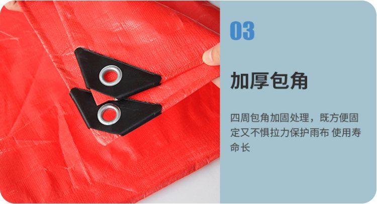 大紅色PE防水篷布加厚包角:四周包角加固處理,既方便固定又不懼拉力保護(hù)雨布,使用壽命長(zhǎng)。