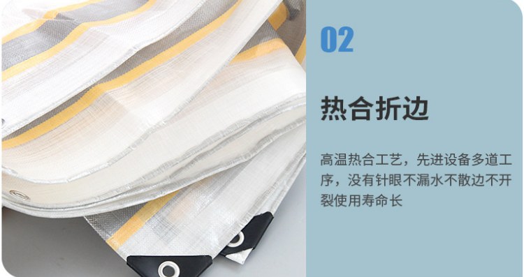 金包銀色PE防水篷布熱合折邊,高溫熱合工藝,先進設(shè)備多道工序,沒有針眼不漏水不散邊不開裂使用壽命長。
