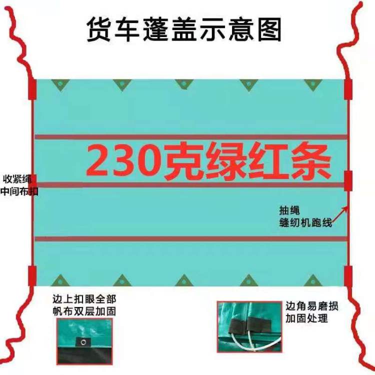 產(chǎn)品介紹綠紅條色PE防水篷布汽車篷布,貨車篷蓋示意圖如上。綠紅條色PE防水篷布高溫?zé)崛燮唇?,無縫拼接不漏水;雙面PE覆膜,雙面防水;金···