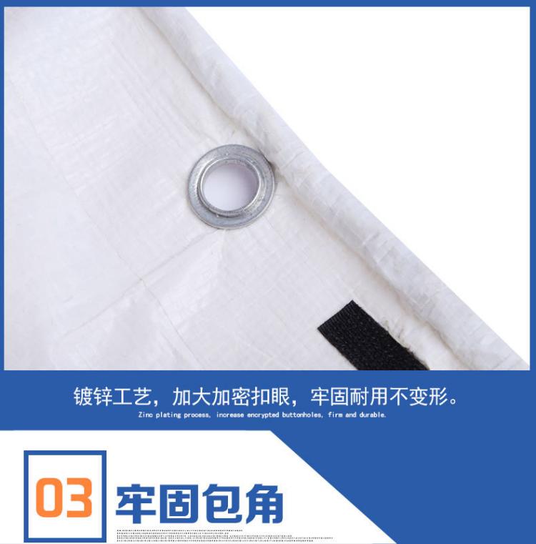 雙白色PE防水篷布牢固包角:鍍鋅工藝,加大加密扣眼,牢固耐用不變形。