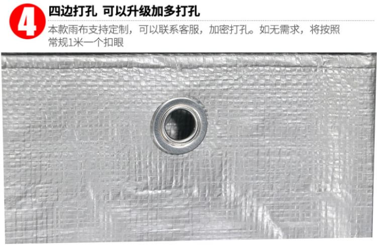 雙銀色PE防水篷布四邊打孔,可以升級加多打孔,本款雨布支持定制,可以加密打孔,如無特殊要求,將按照常規(guī)1米一個(gè)扣眼。