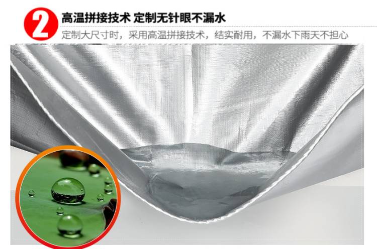 雙銀色PE防水篷布高溫拼接技術(shù),定制無針眼不漏水,定制大尺寸時(shí),采用高溫拼接技術(shù),結(jié)實(shí)耐用,不漏水下雨天不擔(dān)心。