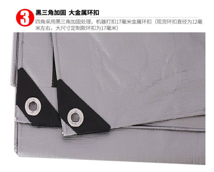 雙銀色PE防水篷布黑三角加固,大金屬環(huán)扣:四角采用黑三角加固處理,機(jī)器打扣17毫米金屬環(huán)扣(現(xiàn)貨環(huán)扣直徑為12毫米左右,大尺寸定制款環(huán)扣為17毫米)